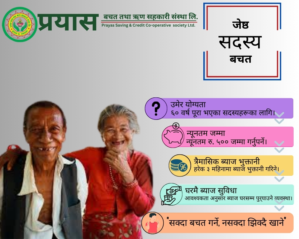 जेष्ठ सदस्य बचत योजनाहाम्रा आदरणीय जेष्ठ नागरिक सदस्यहरूका लागि विशेष रूपमा तयार पारिएको हो। यो योजनाले उहाँहरूको जीवनको उत्तरार्धमा आर्थिक सुरक्षा र सहजता प्रदान गर्दछ, जसले गर्दा उहाँहरूले आफ्नो आवश्यकता अनुसार ब्याज घरमै प्राप्त गर्न सक्नुहुन्छ।